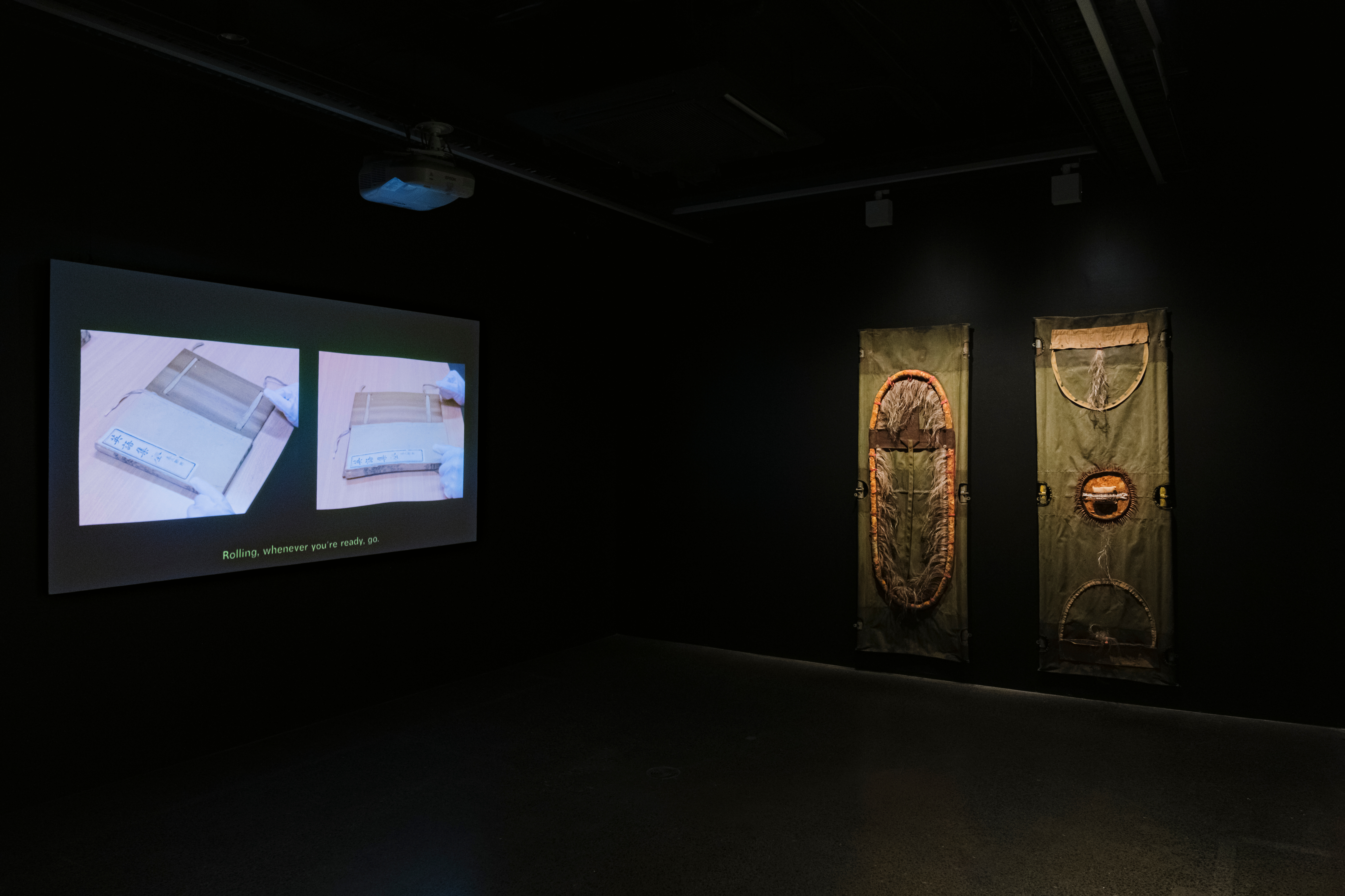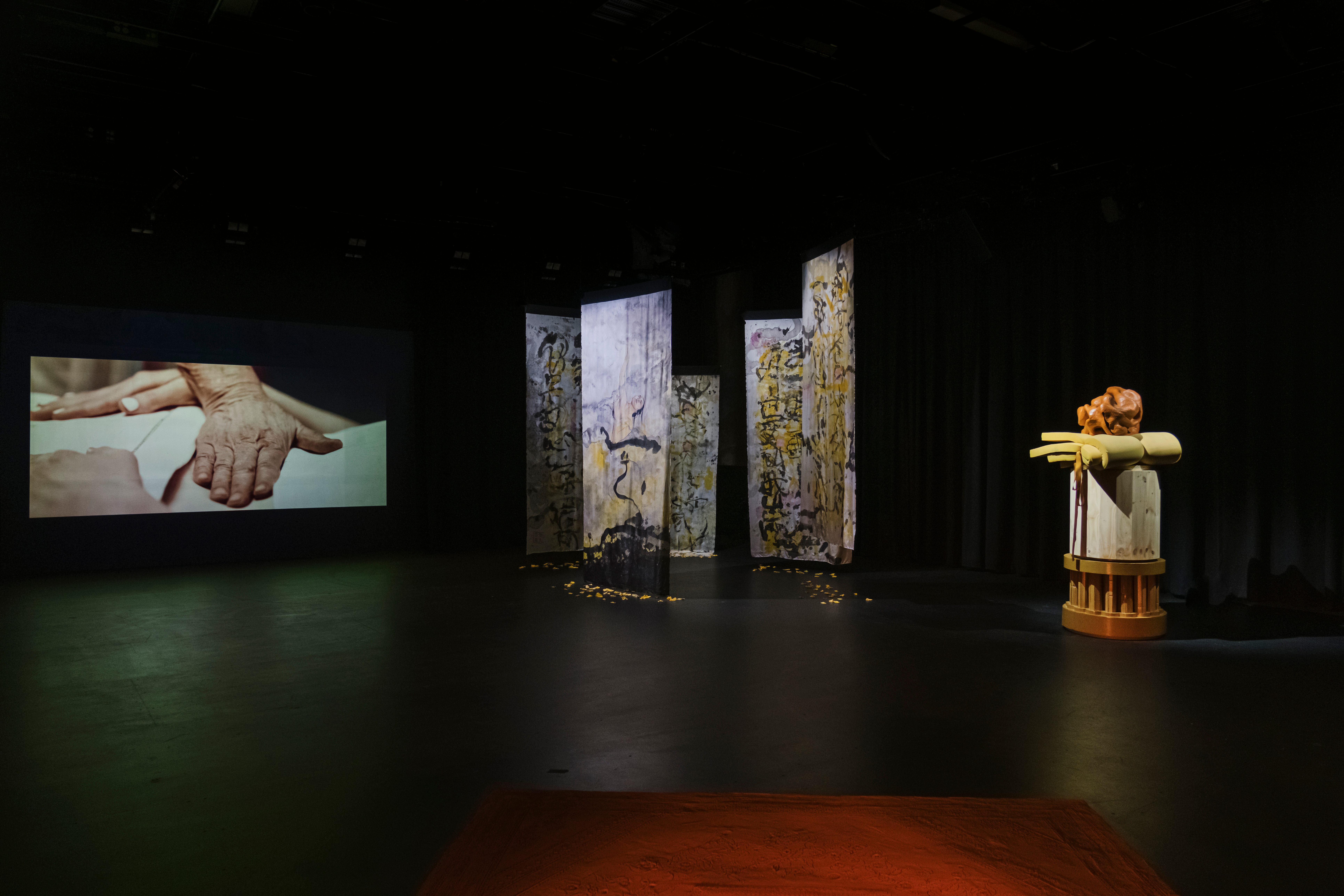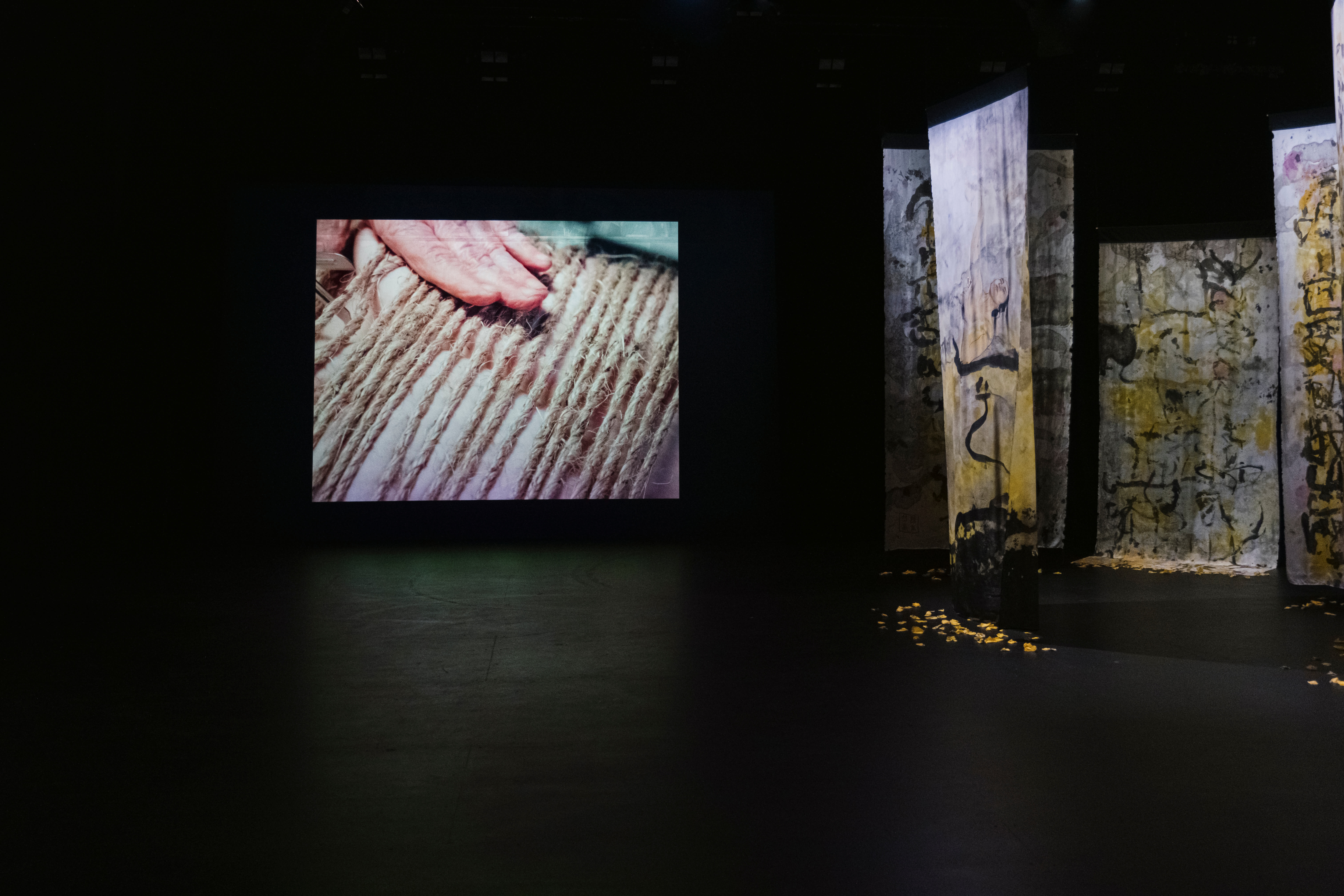 immersive installations that combine silk paintings, traditional weaving, sound